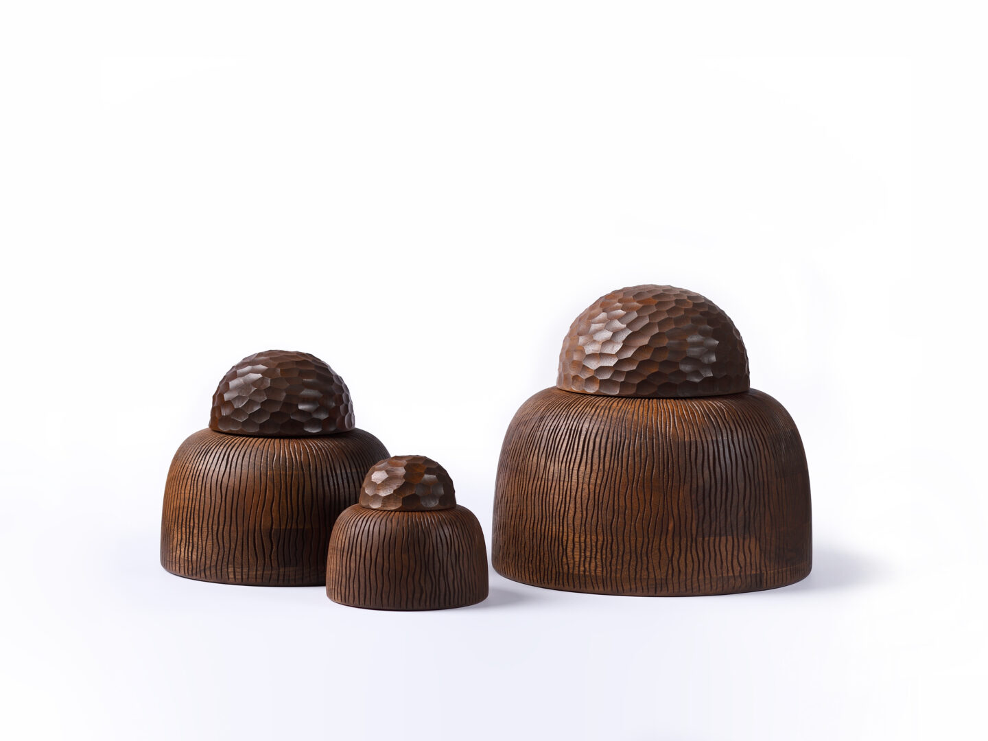 “The small containers are abstract forms that look like mysterious living organisms. The sculpted textures of the caps and linear stem carvings explore the Zanat woodcarving tradition in ways that enhance the organic forms and material. These ‘wood creatures’ are meant to be fantasy companions in our everyday life.”